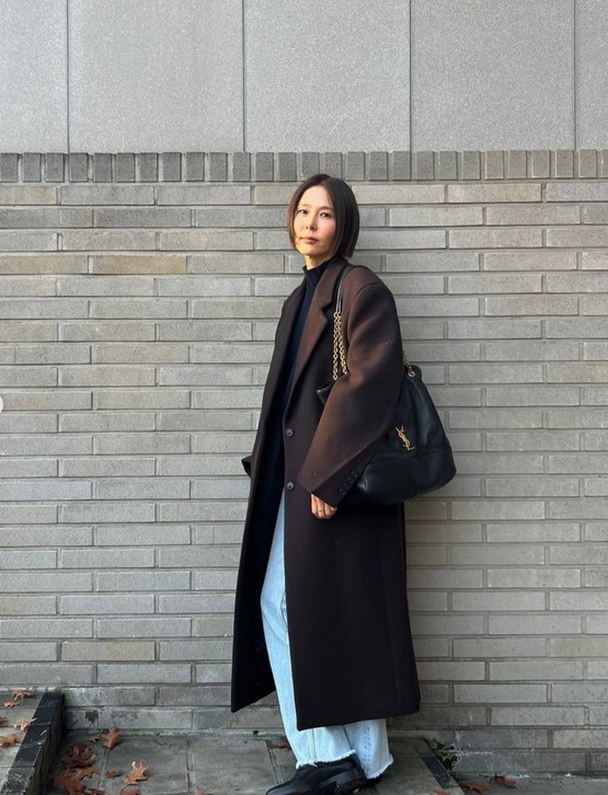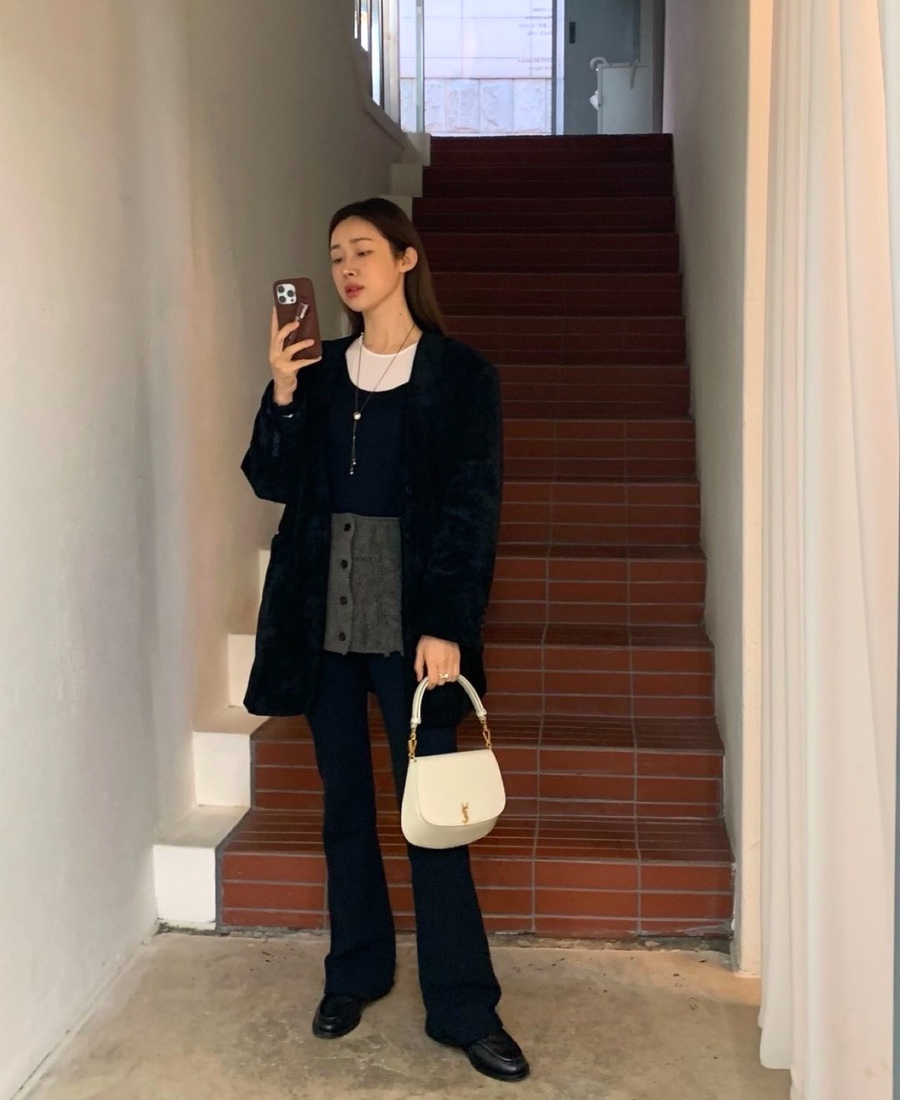 조금 캐주얼하면서도 차분한 느낌을 원한다면 벨벳이나 코듀로이 느낌의 네이비 코트를 선택해 보세요. 차정원 배우처럼 이너를 니트 소재와 레이어드하여 감각적으로 스타일링하면 더욱 멋진 하객룩을 완성할 수 있습니다.