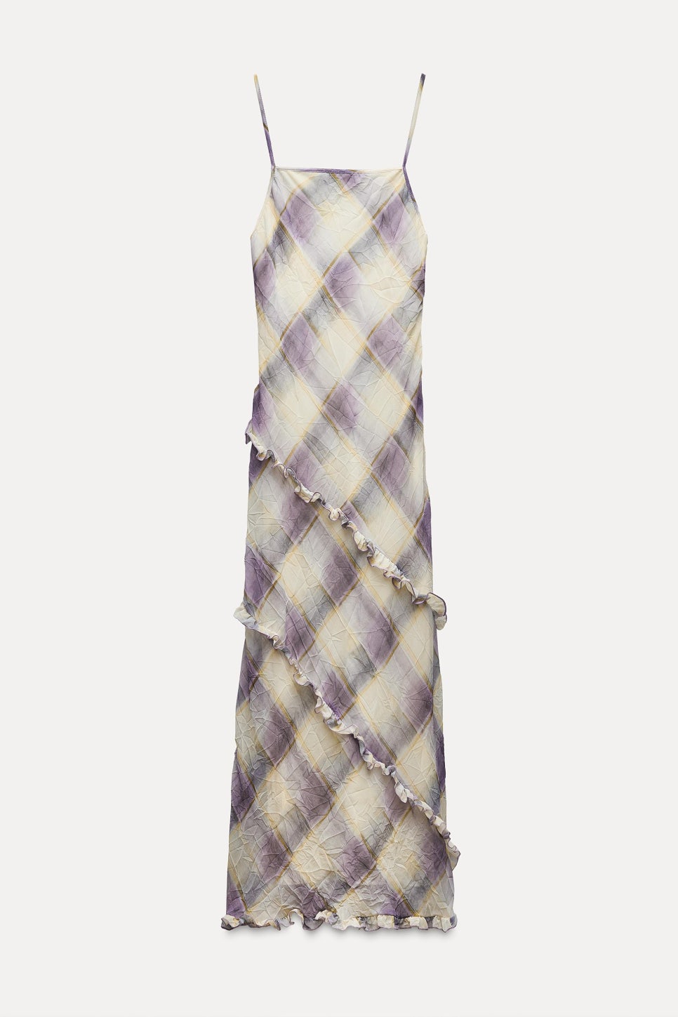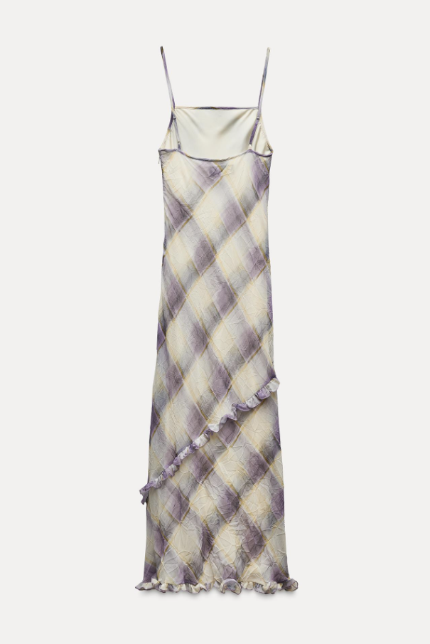 해당 원피스는 자라(ZARA) 제품으로, 프릴 디테일과 체크 패턴이 사랑스럽게 어우러진 뷔스티에 스타일의 맥시 원피스입니다. 길이감이 길어서 우아한 분위기를 연출할 수 있는 것이 특징이죠.