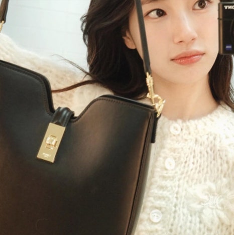 수지가 착용한 사이즈는 스몰로 가격은 410만원으로 고급스러운 디자인이 특징입니다. 특히 블랙 컬러는 전체적인 룩에 무게감을 주며, 심플한 디자인에 셀린느의 아이코닉한 디테일이 더해져 다양한 룩에 잘 어울립니다.