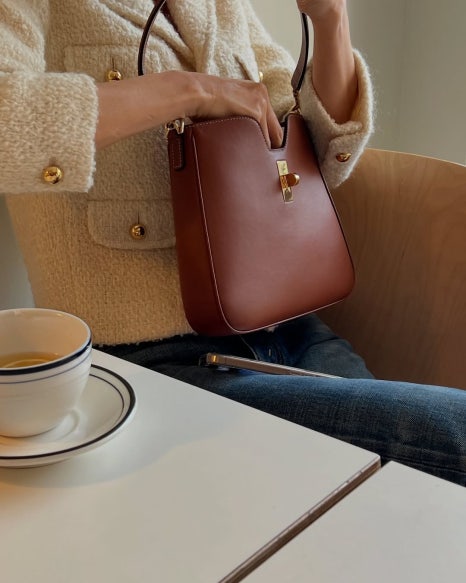 김나영도 셀린느 까미유백 브라운을 착용하여 드뮤어룩의 정석을 보여주었는데요. 고급스럽고 클래식한 디자인이라서 다양한 착장에 활용할 수 있습니다. 김나영은 짧은 핸들을 사용하여 숄더로 착용한 모습이며, 끈 길이 조절이 가능하여 캐주얼하면서도 자연스러운 크로스백으로도 착용가능하다고 합니다.