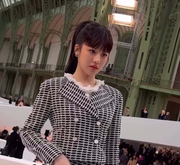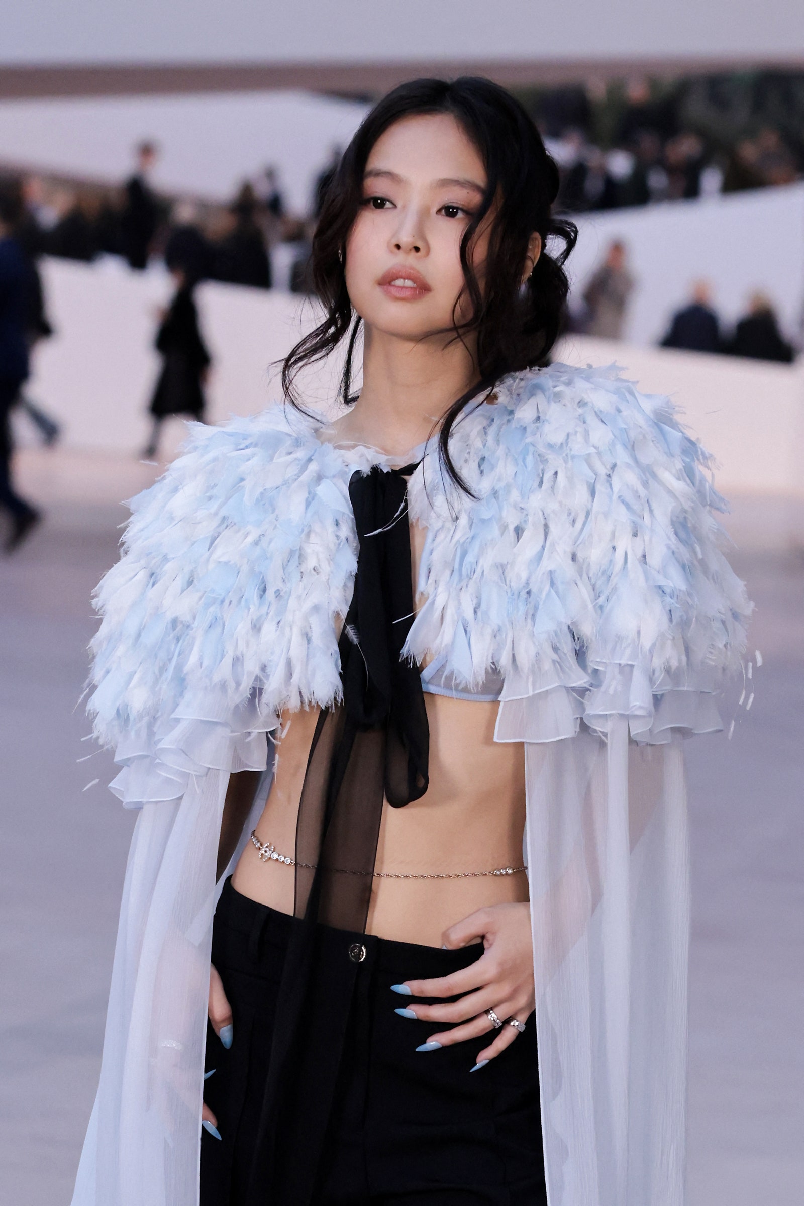 제니는 샤넬 2025 SS 컬렉션의 72번 룩을 착용했습니다. 하늘하늘한 러플 장식과 시스루 케이프 디자인이 특징으로, 드레이프하게 떨어지는 케이프 사이로 제니의 바디라인을 더욱 돋보이게 연출한 점이 눈길을 끌었습니다. 제니가 유행시킨 발레코어 룩이 오버랩되면서 그녀만의 개성과 우아함을 강조하며 여전히 영향력 있는 샤넬의 뮤즈로서의 면모를 확실히 보여주었습니다.